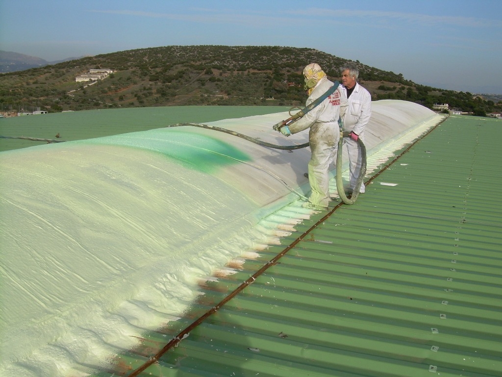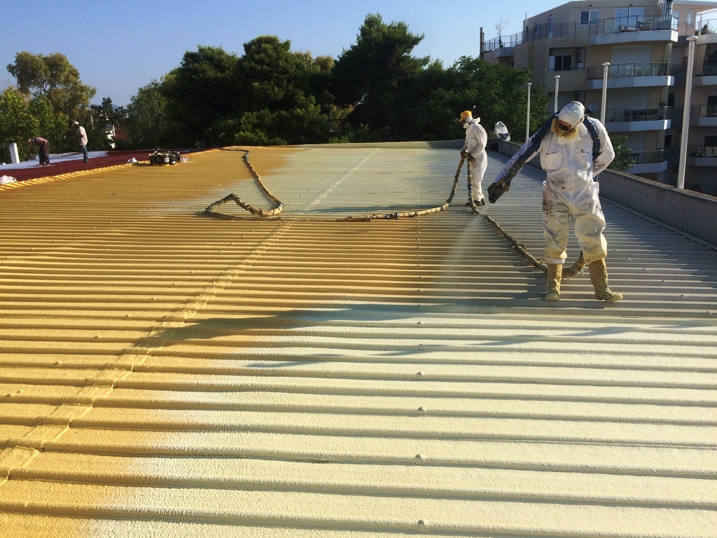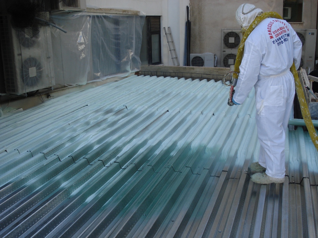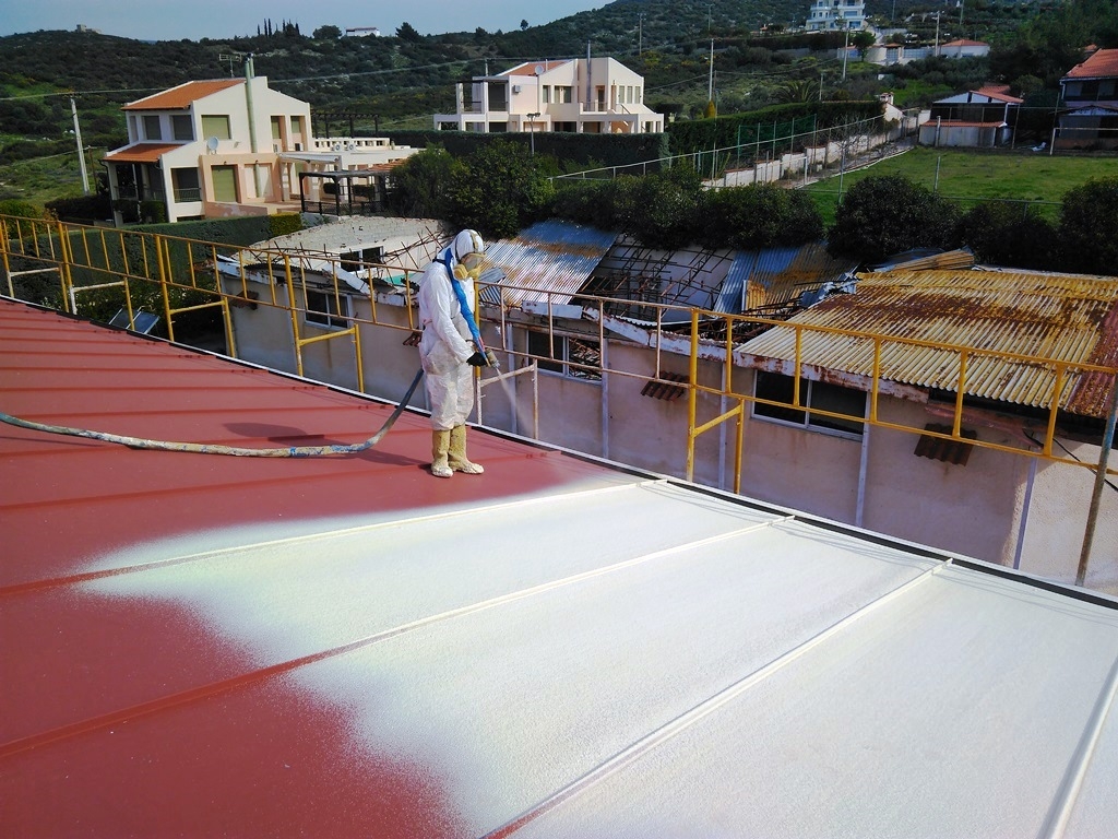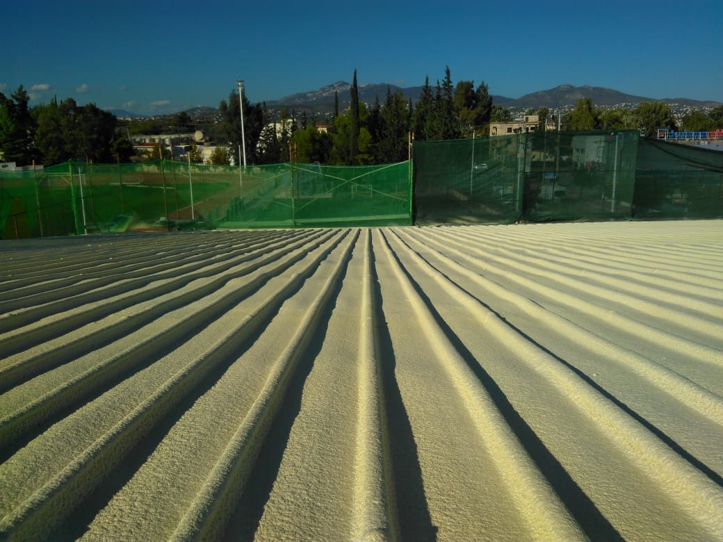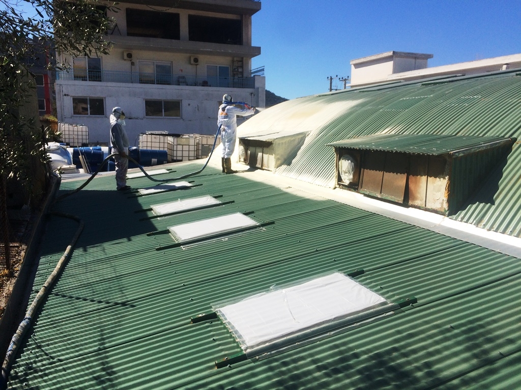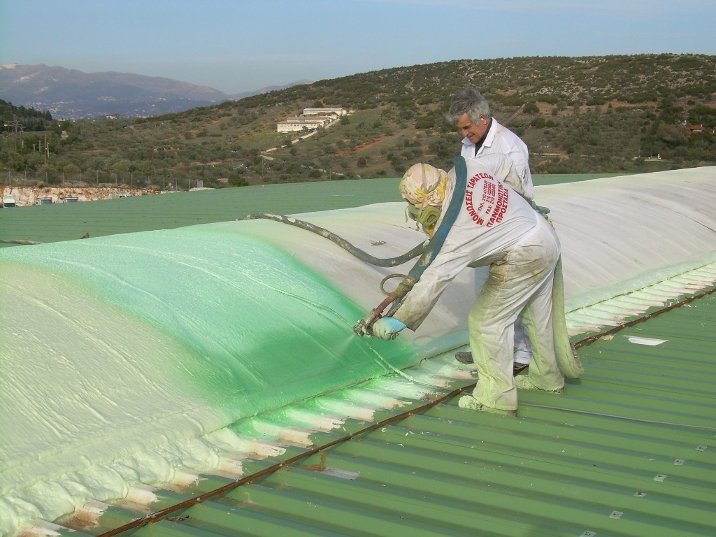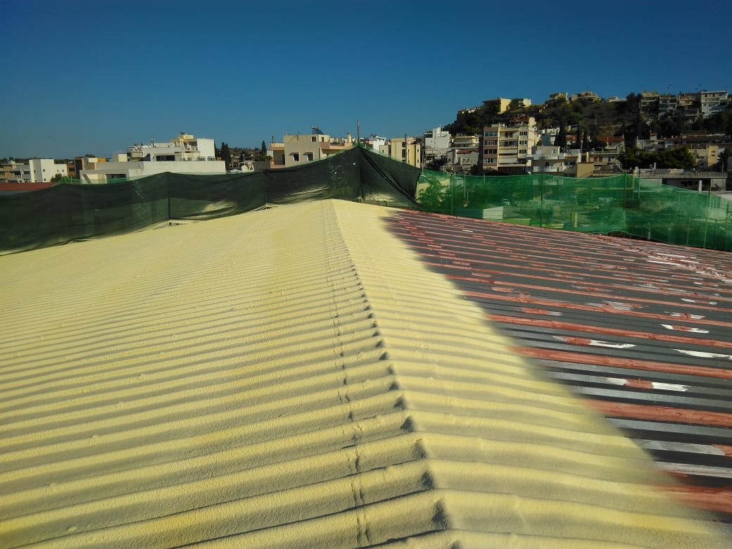 Το πιστοποιημένο ψεκαζόμενο σύστημα μόνωσης Αφρού Πολυουρεθάνης σε συνδυασμό με την επίστρωση Ελαστομερών Πολυουρεθανικών Ρητινών, πάνω σε μεταλλικές επιφάνειες (τραπεζοειδή λαμαρίνα, Ελλενίτ κ.ά), εφαρμόζεται με επιτυχία ώστε να καλύψει τις σημαντικές και ιδιαίτερες απαιτήσεις του έργου σε θερμομόνωση & στεγανοποίηση κάτω υπό ακραίες καιρικές συνθήκες. Η ενιαία μονολιθική επιφάνεια χωρίς αρμούς, ενώσεις και ραφές καταστεί την επιφάνεια απολύτως στεγανή και τέλεια θερμομονωμένη, με εξαιρετική αντοχή ακόμα και σε ακραίες καιρικές συνθήκες και χημικές ατμοσφαιρικές επιδράσεις όπως βροχή, άνεμο, άλατα, νέφος, οξέα, κ.λ.