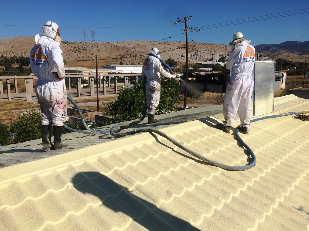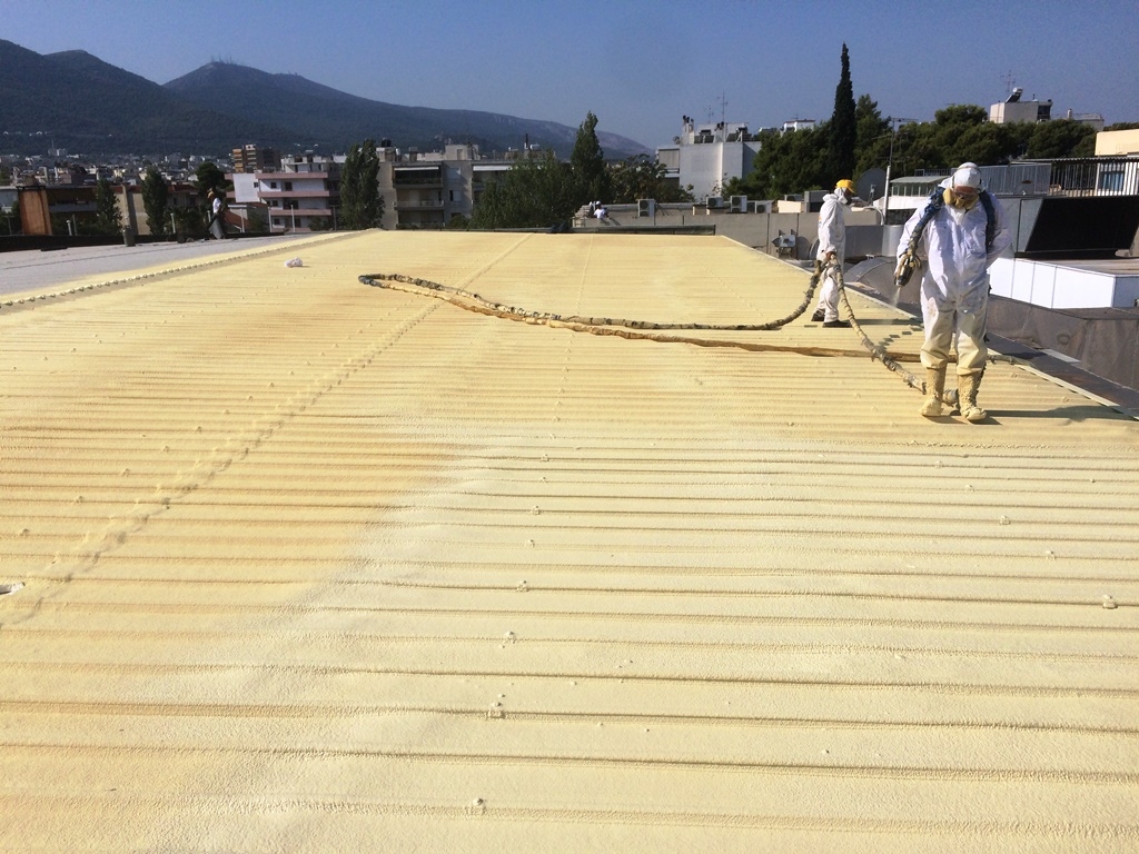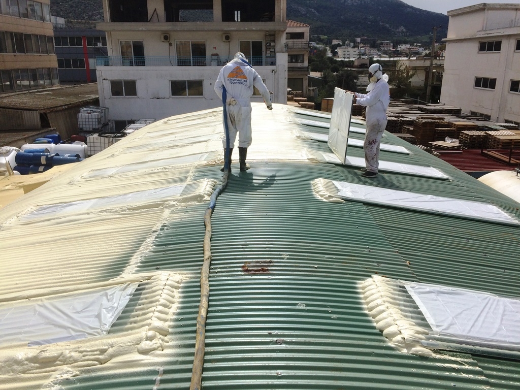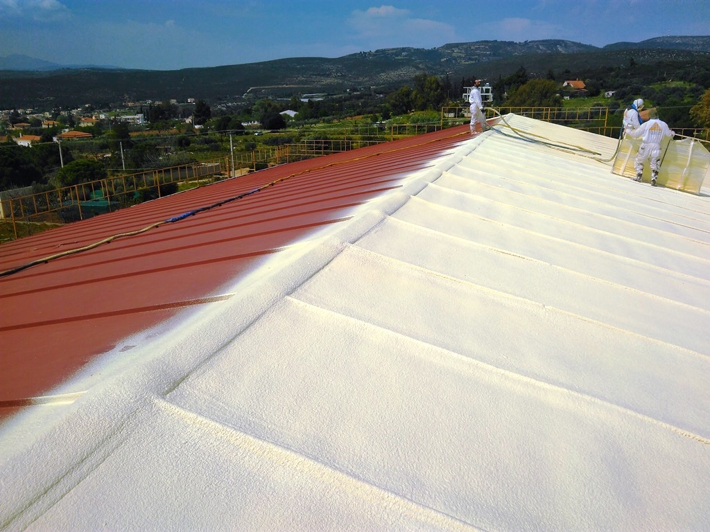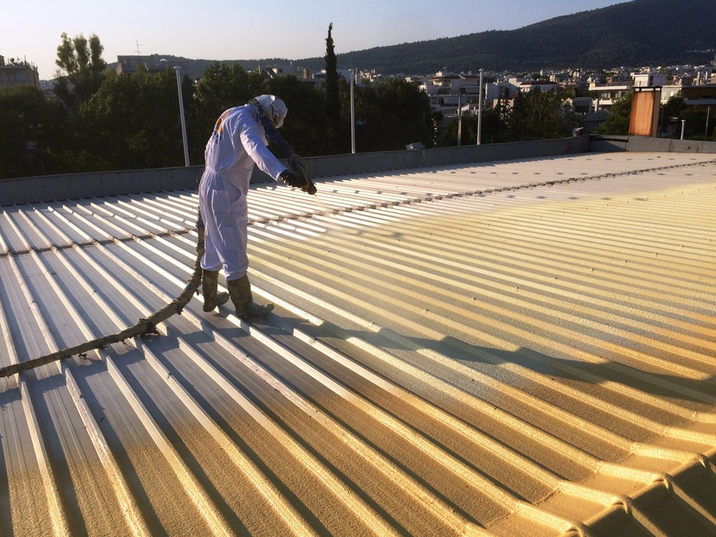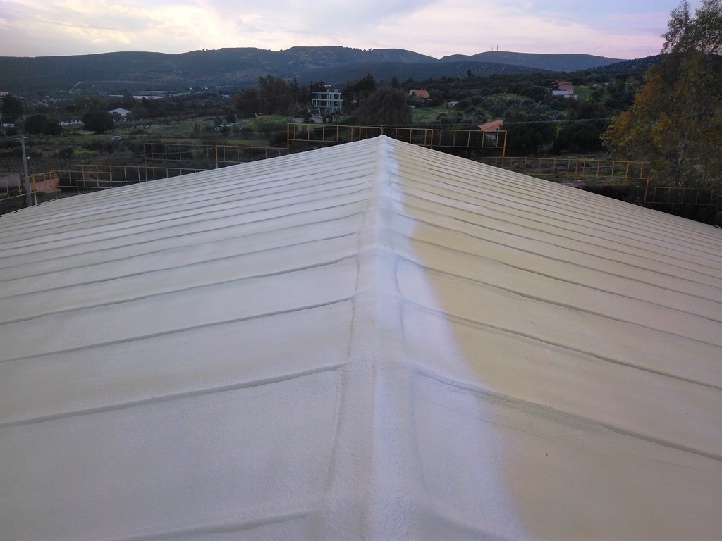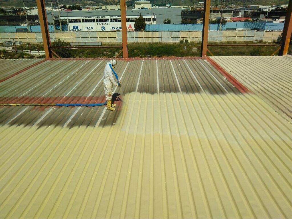 Το πιστοποιημένο ψεκαζόμενο σύστημα μόνωσης Αφρού Πολυουρεθάνης σε συνδυασμό με την επίστρωση Ελαστομερών Πολυουρεθανικών Ρητινών, πάνω σε μεταλλικές επιφάνειες (τραπεζοειδή λαμαρίνα, Ελλενίτ κ.ά), εφαρμόζεται με επιτυχία ώστε να καλύψει τις σημαντικές και ιδιαίτερες απαιτήσεις του έργου σε θερμομόνωση & στεγανοποίηση κάτω υπό ακραίες καιρικές συνθήκες. Η ενιαία μονολιθική επιφάνεια χωρίς αρμούς, ενώσεις και ραφές καταστεί την επιφάνεια απολύτως στεγανή και τέλεια θερμομονωμένη, με εξαιρετική αντοχή ακόμα και σε ακραίες καιρικές συνθήκες και χημικές ατμοσφαιρικές επιδράσεις όπως βροχή, άνεμο, άλατα, νέφος, οξέα, κ.λ.