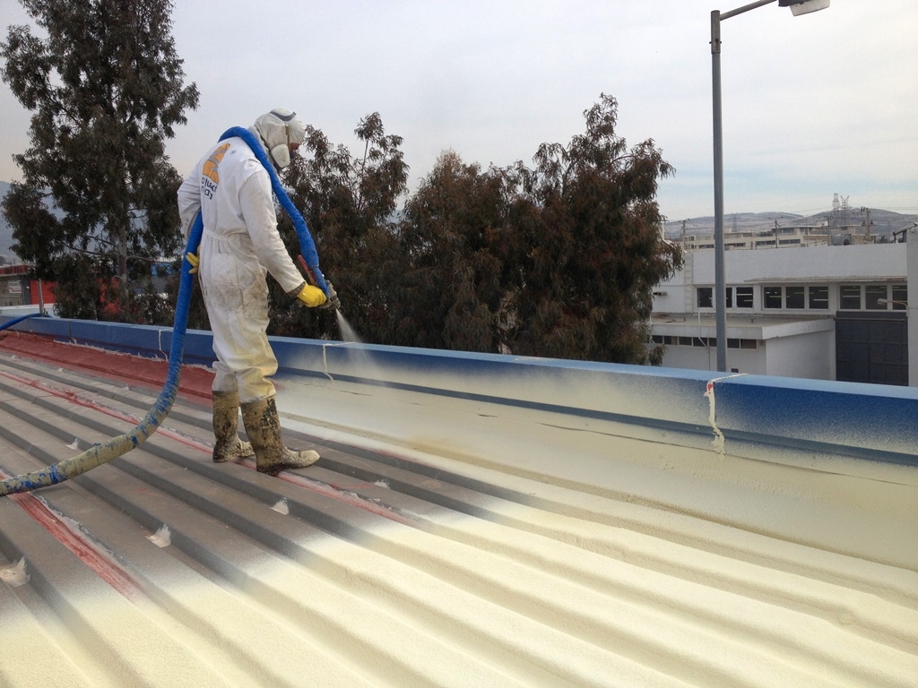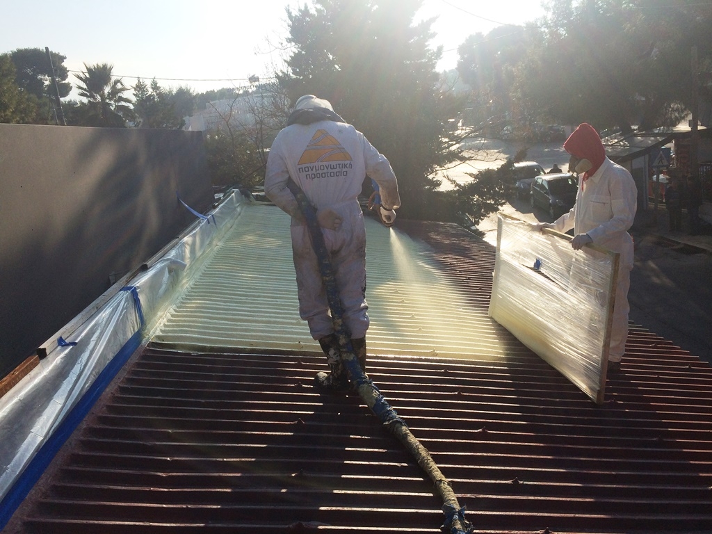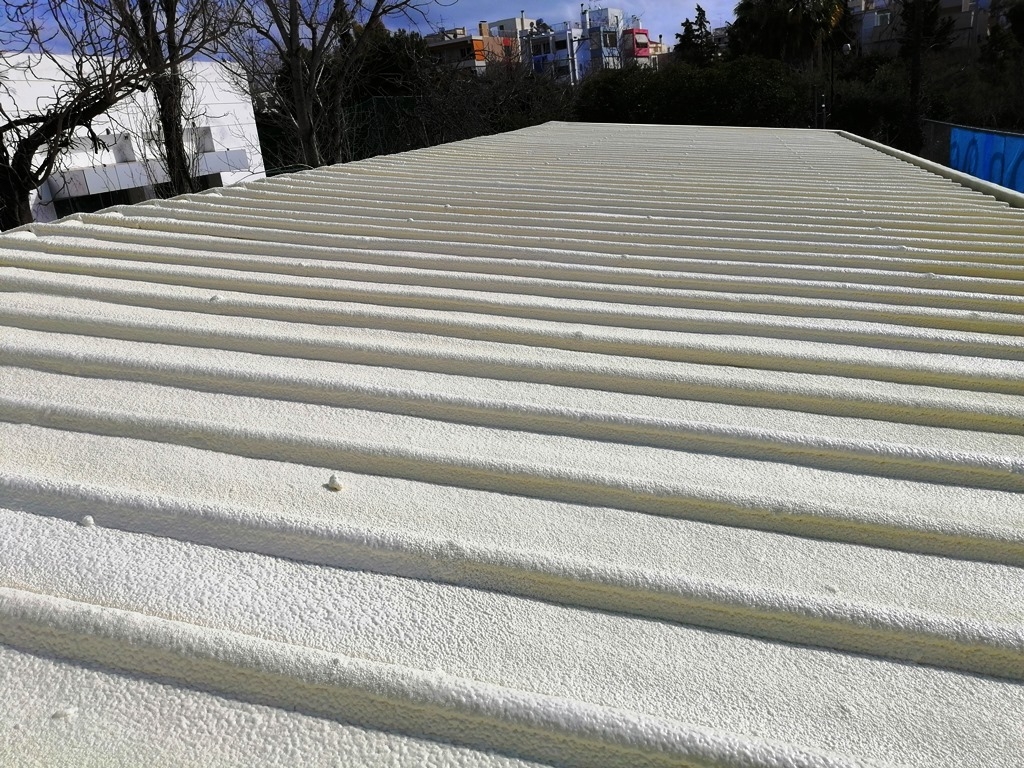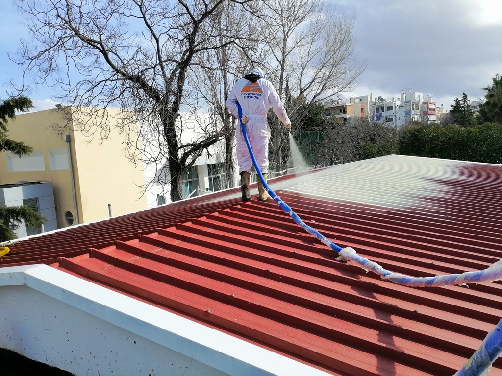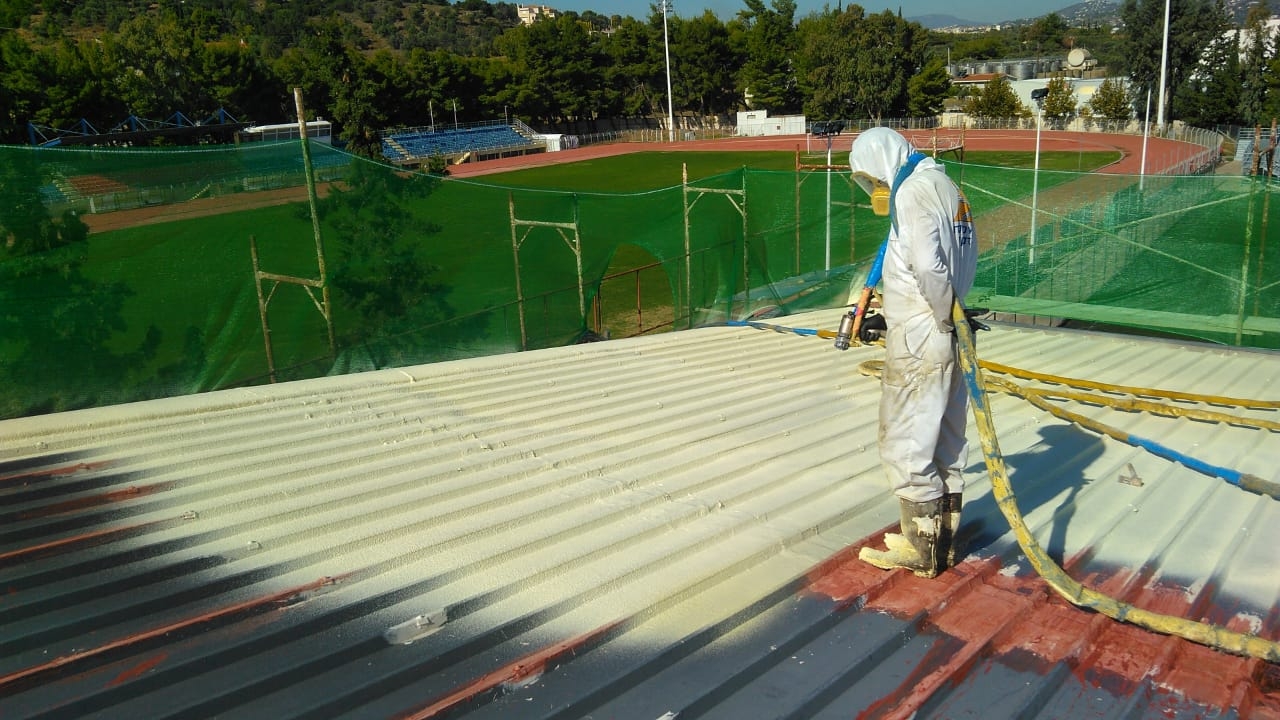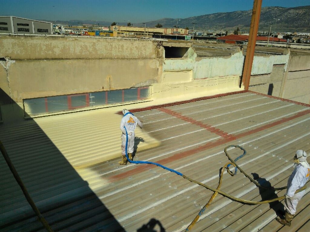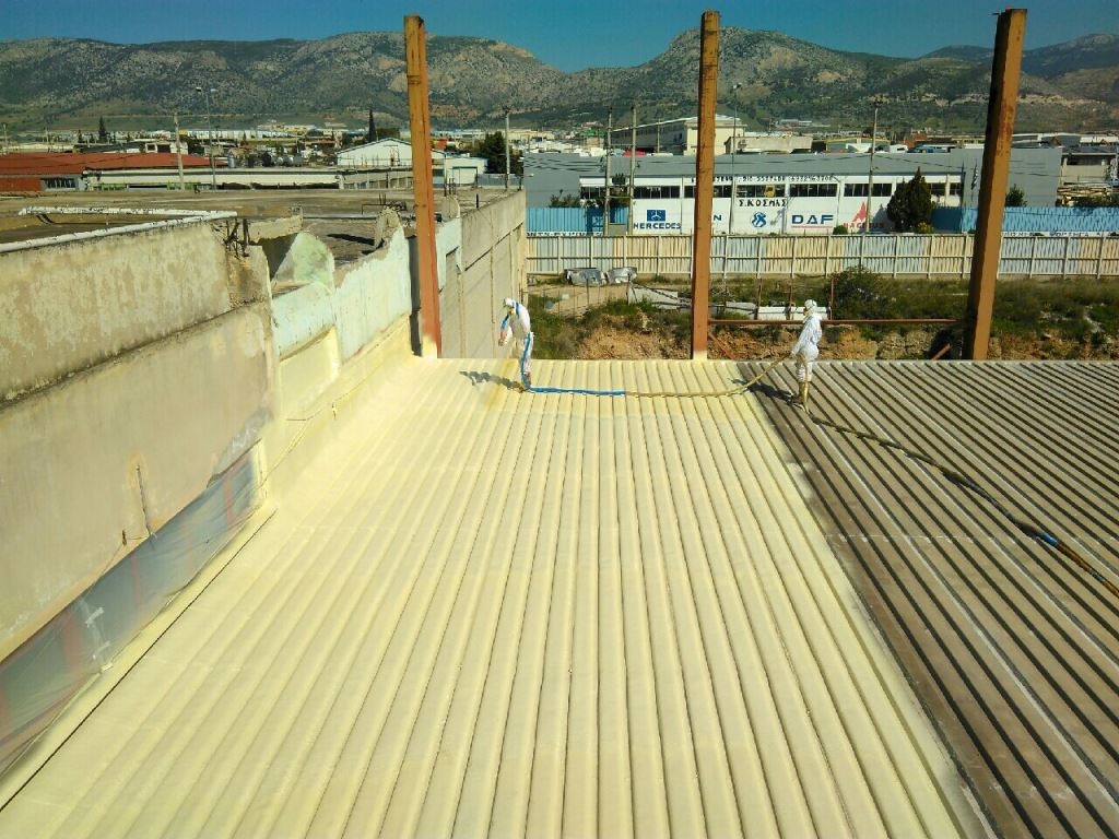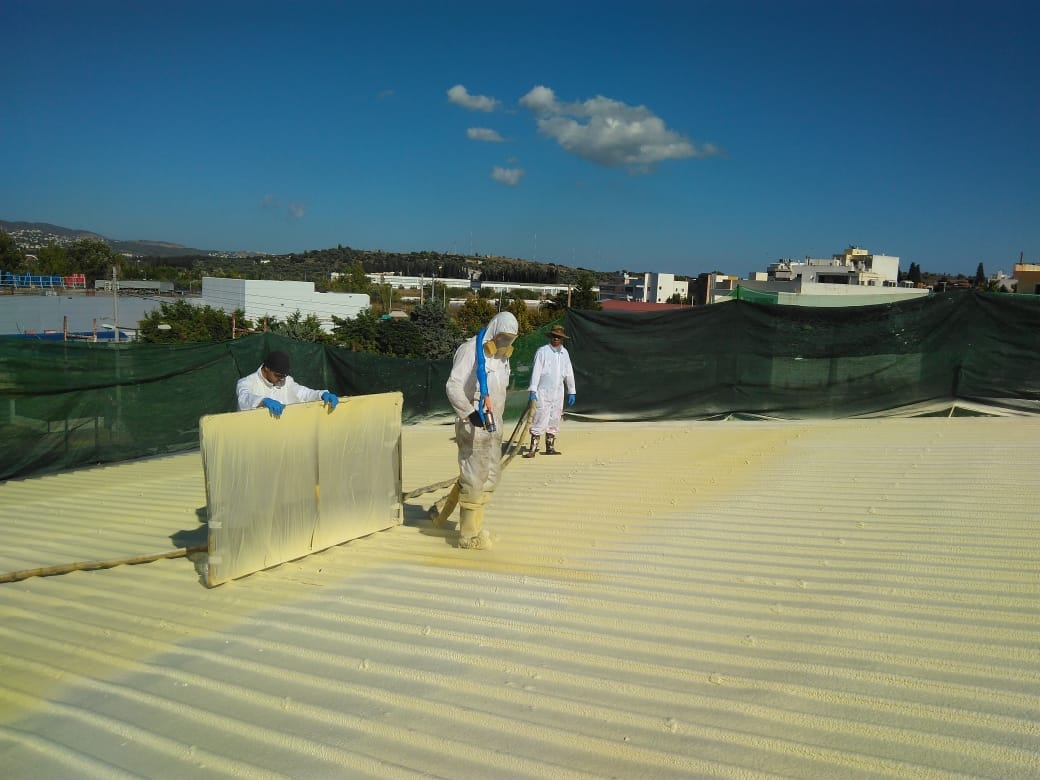 Το πιστοποιημένο ψεκαζόμενο σύστημα μόνωσης Αφρού Πολυουρεθάνης σε συνδυασμό με την επίστρωση Ελαστομερών Πολυουρεθανικών Ρητινών, πάνω σε μεταλλικές επιφάνειες (τραπεζοειδή λαμαρίνα, Ελλενίτ κ.ά), εφαρμόζεται με επιτυχία ώστε να καλύψει τις σημαντικές και ιδιαίτερες απαιτήσεις του έργου σε θερμομόνωση & στεγανοποίηση κάτω υπό ακραίες καιρικές συνθήκες. Η ενιαία μονολιθική επιφάνεια χωρίς αρμούς, ενώσεις και ραφές καταστεί την επιφάνεια απολύτως στεγανή και τέλεια θερμομονωμένη, με εξαιρετική αντοχή ακόμα και σε ακραίες καιρικές συνθήκες και χημικές ατμοσφαιρικές επιδράσεις όπως βροχή, άνεμο, άλατα, νέφος, οξέα, κ.λ.