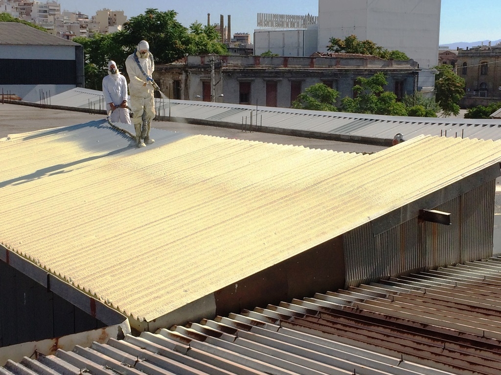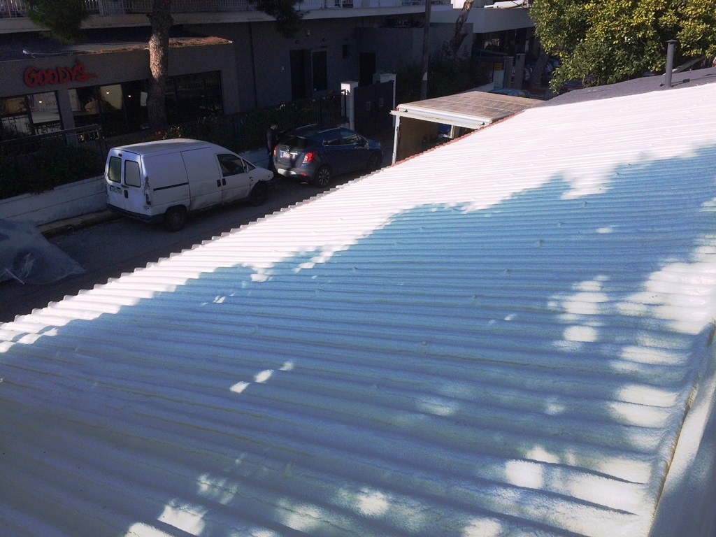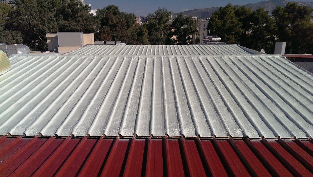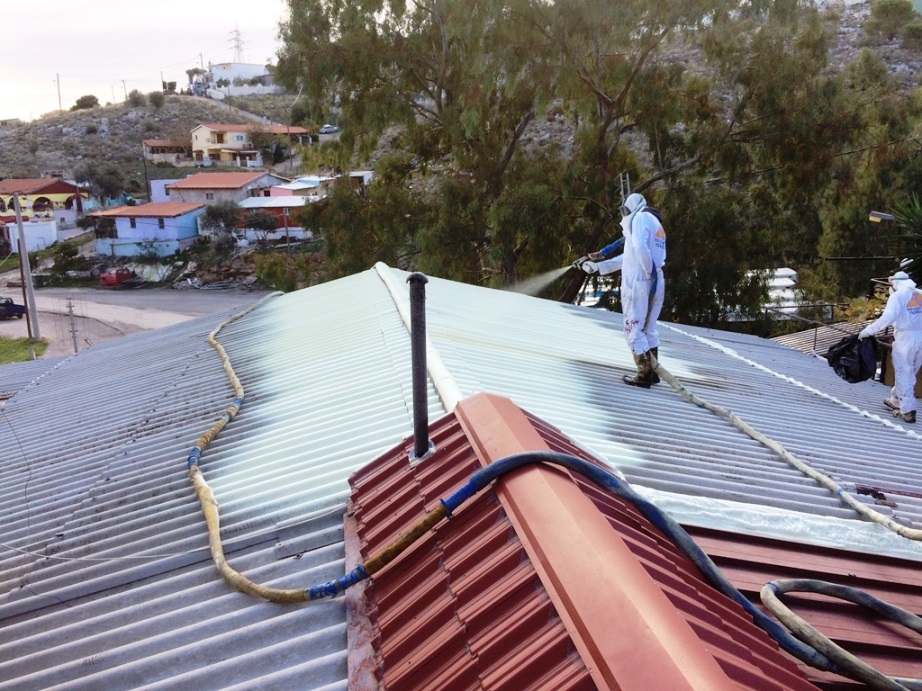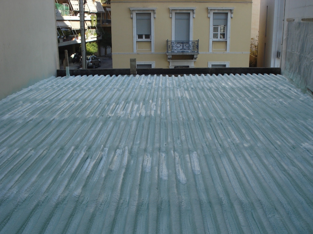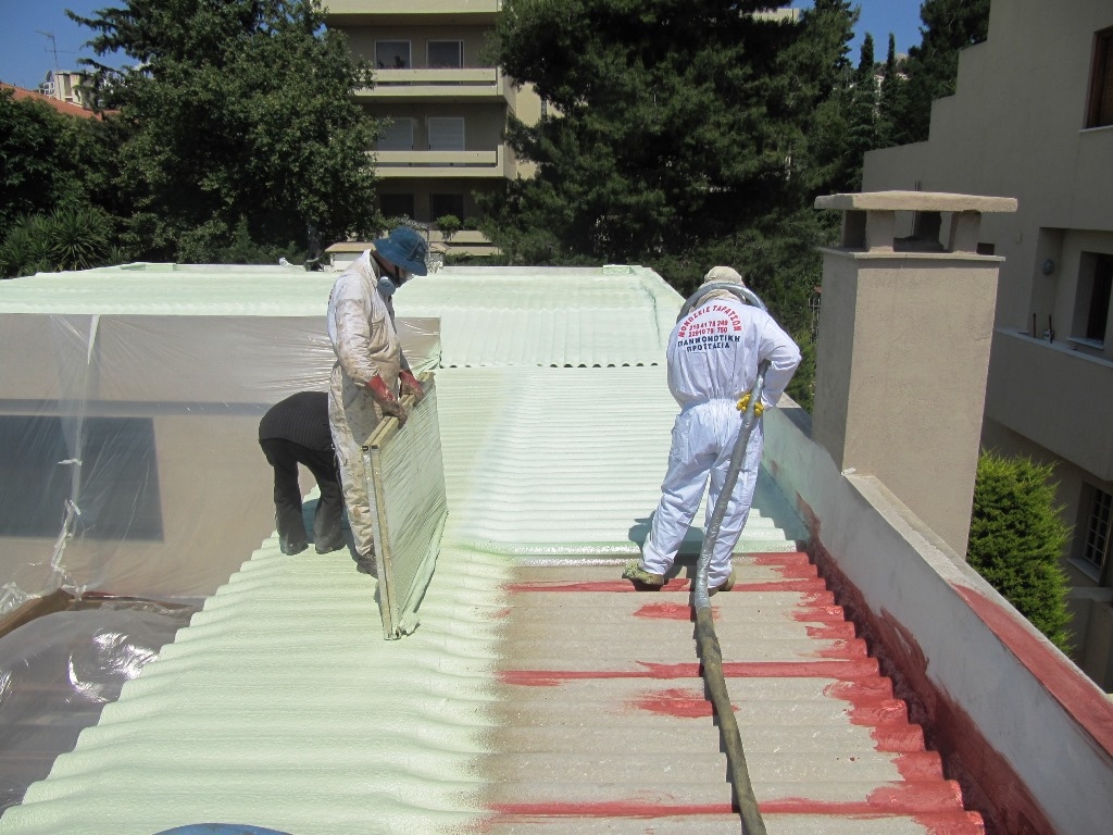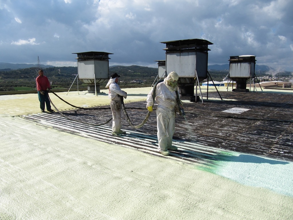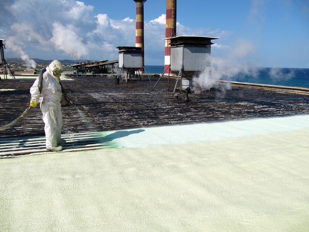Το πιστοποιημένο ψεκαζόμενο σύστημα μόνωσης Αφρού Πολυουρεθάνης σε συνδυασμό με την επίστρωση Ελαστομερών Πολυουρεθανικών Ρητινών, πάνω σε μεταλλικές επιφάνειες (τραπεζοειδή λαμαρίνα, Ελλενίτ κ.ά), εφαρμόζεται με επιτυχία ώστε να καλύψει τις σημαντικές και ιδιαίτερες απαιτήσεις του έργου σε θερμομόνωση & στεγανοποίηση κάτω υπό ακραίες καιρικές συνθήκες. Η ενιαία μονολιθική επιφάνεια χωρίς αρμούς, ενώσεις και ραφές καταστεί την επιφάνεια απολύτως στεγανή και τέλεια θερμομονωμένη, με εξαιρετική αντοχή ακόμα και σε ακραίες καιρικές συνθήκες και χημικές ατμοσφαιρικές επιδράσεις όπως βροχή, άνεμο, άλατα, νέφος, οξέα, κ.λ.