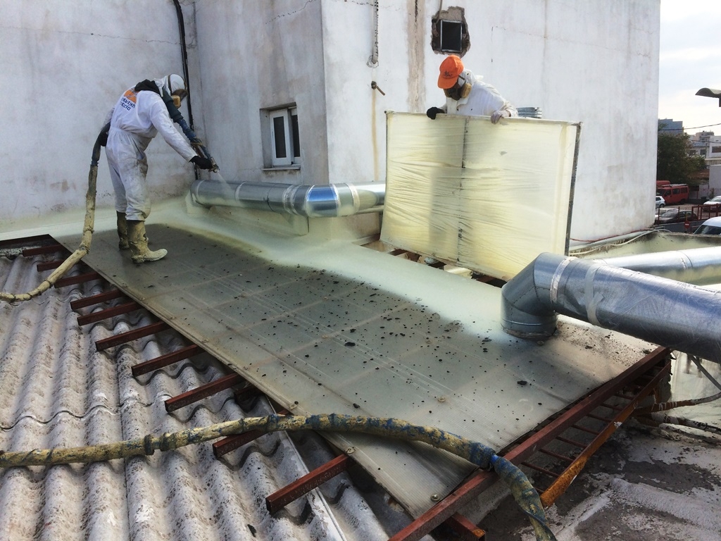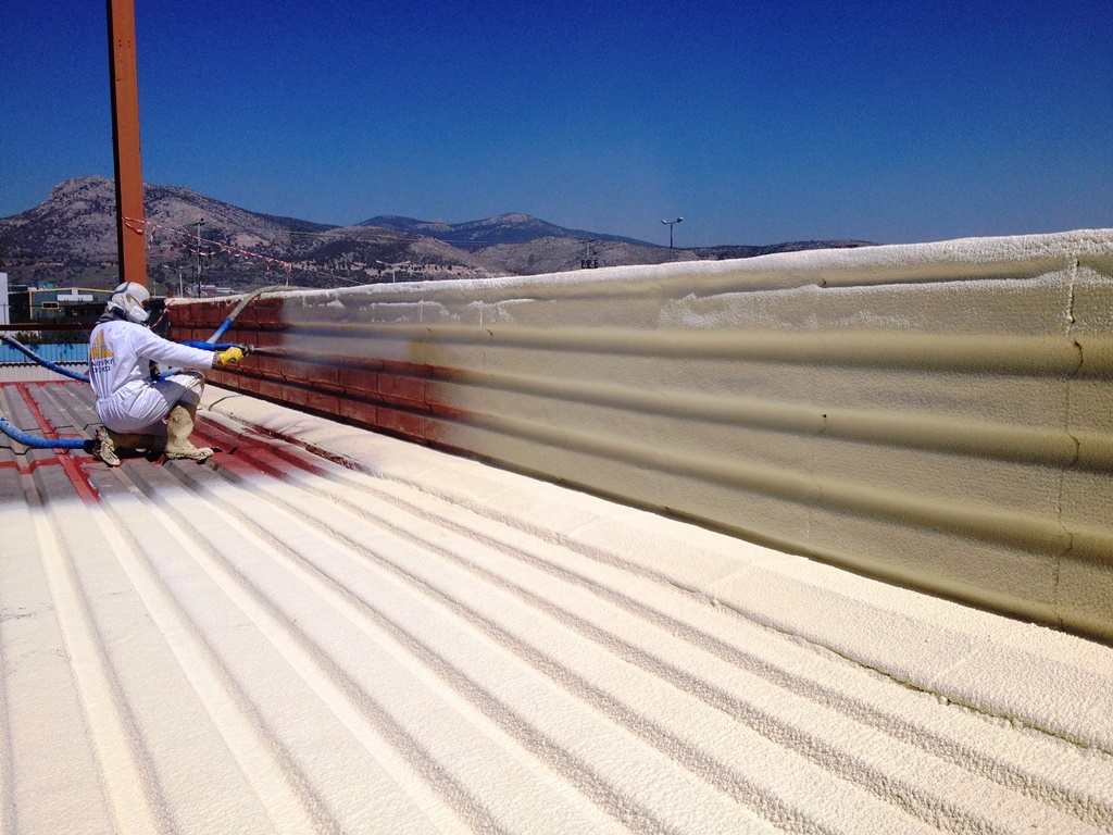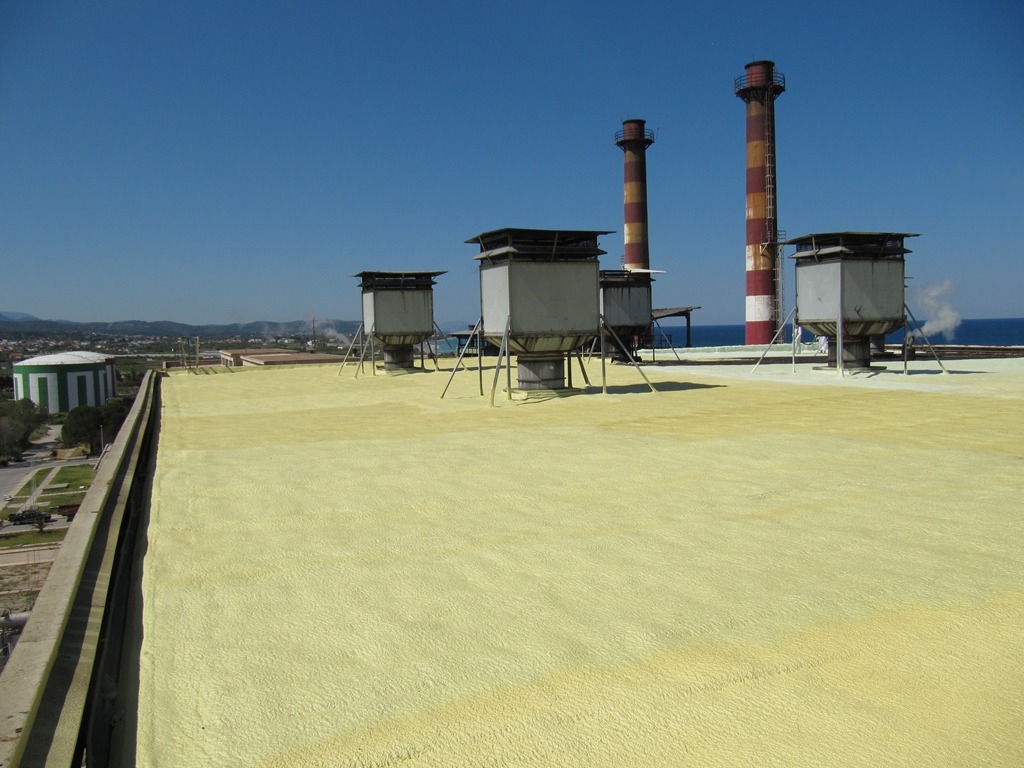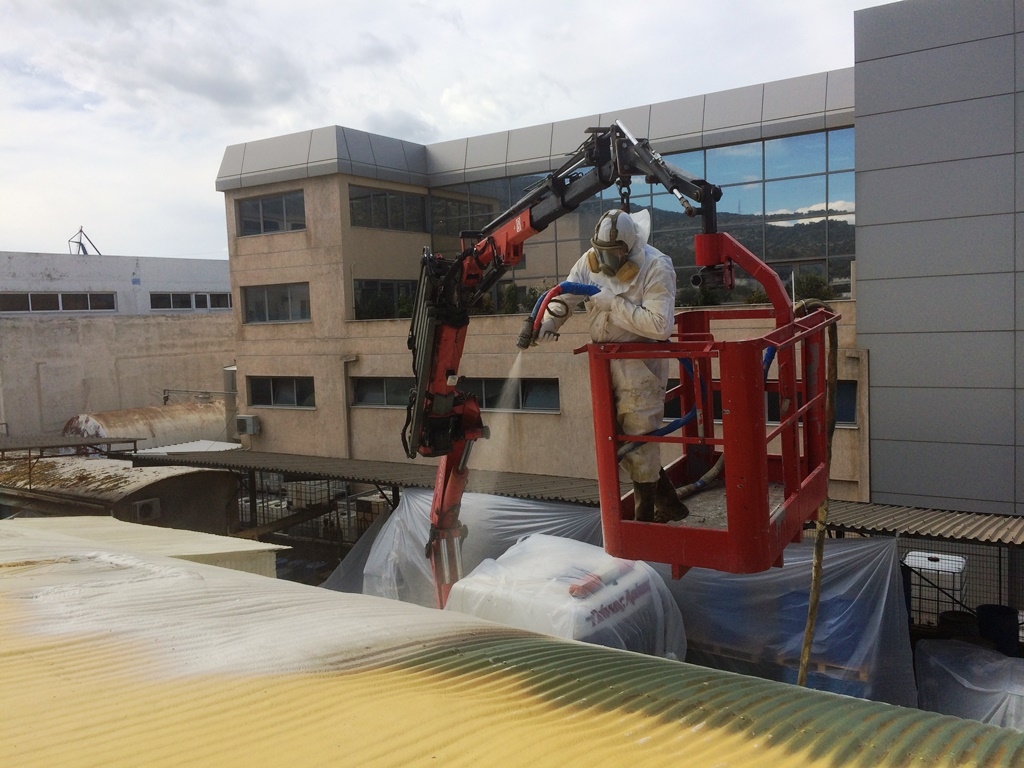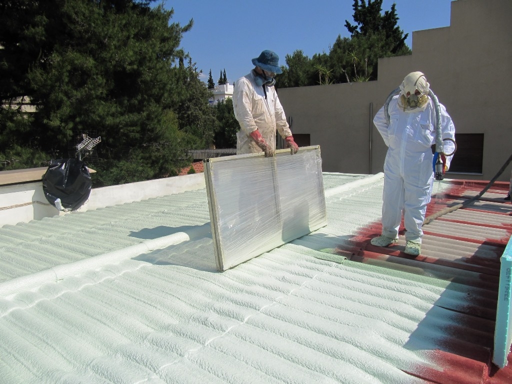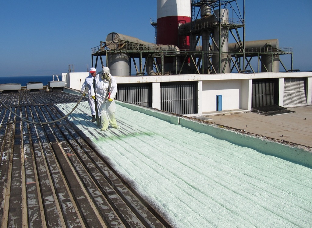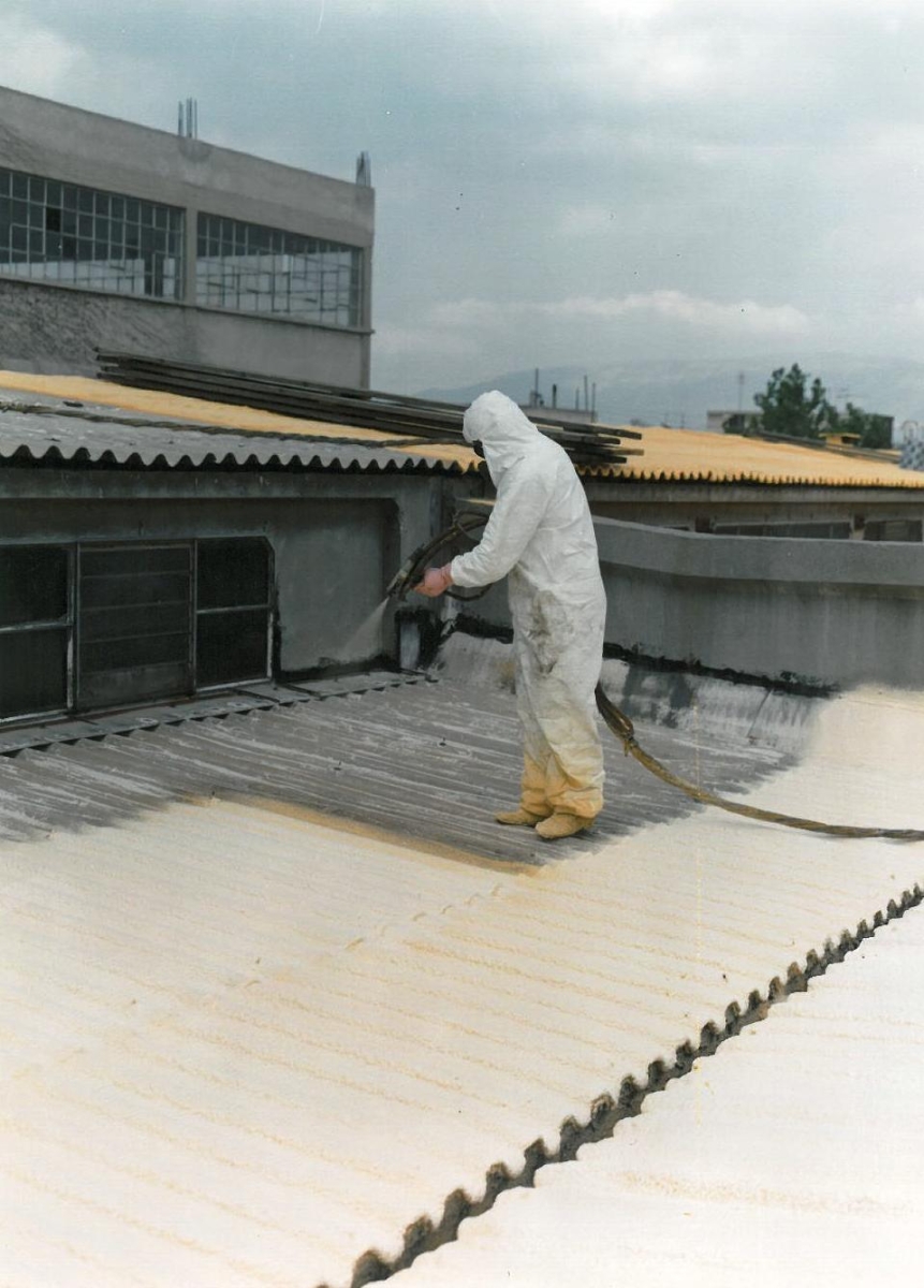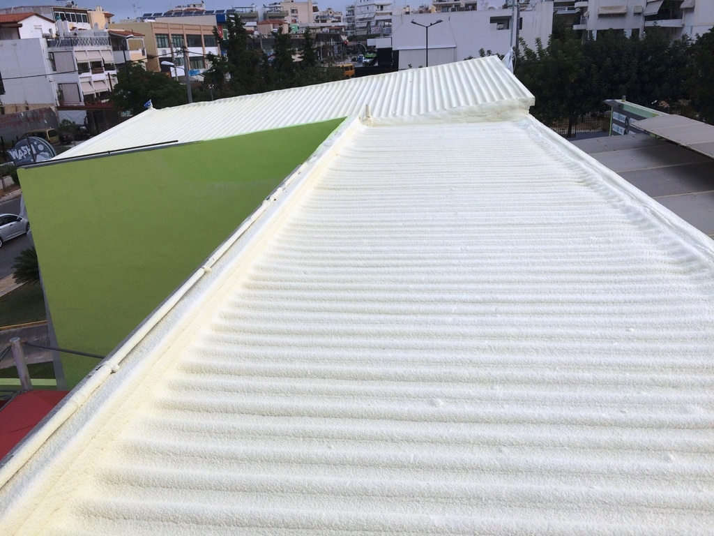 Το πιστοποιημένο ψεκαζόμενο σύστημα μόνωσης Αφρού Πολυουρεθάνης σε συνδυασμό με την επίστρωση Ελαστομερών Πολυουρεθανικών Ρητινών, πάνω σε μεταλλικές επιφάνειες (τραπεζοειδή λαμαρίνα, Ελλενίτ κ.ά), εφαρμόζεται με επιτυχία ώστε να καλύψει τις σημαντικές και ιδιαίτερες απαιτήσεις του έργου σε θερμομόνωση & στεγανοποίηση κάτω υπό ακραίες καιρικές συνθήκες. Η ενιαία μονολιθική επιφάνεια χωρίς αρμούς, ενώσεις και ραφές καταστεί την επιφάνεια απολύτως στεγανή και τέλεια θερμομονωμένη, με εξαιρετική αντοχή ακόμα και σε ακραίες καιρικές συνθήκες και χημικές ατμοσφαιρικές επιδράσεις όπως βροχή, άνεμο, άλατα, νέφος, οξέα, κ.λ.